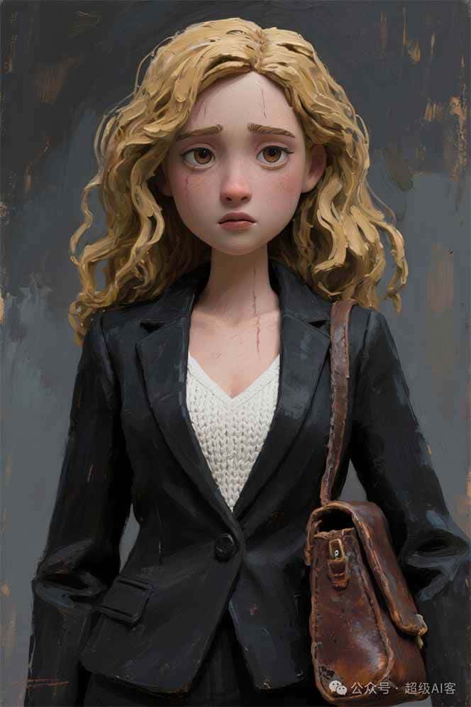 *她有一张精致的、略显憔悴的脸庞,被她那长长的金色波浪卷发,每一缕发丝都像是用厚涂技法(impasto)精心塑造的,带有清晰的笔触痕迹。她那双杏仁状的大眼睛忧郁地低垂着,小巧而精心雕琢的嘴唇微微张开。她身着一套剪裁利落的黑色西装,西装外套的布料上能看到哑光的、有质感的笔触。西装内搭一件洁白的白色v领毛制吊带,其针织纹理通过精细的油彩凸起巧妙地表现出来。她的一只胳膊上挎着一个牛皮包,包的表面呈现出一种带有磨损感的皮革质地。