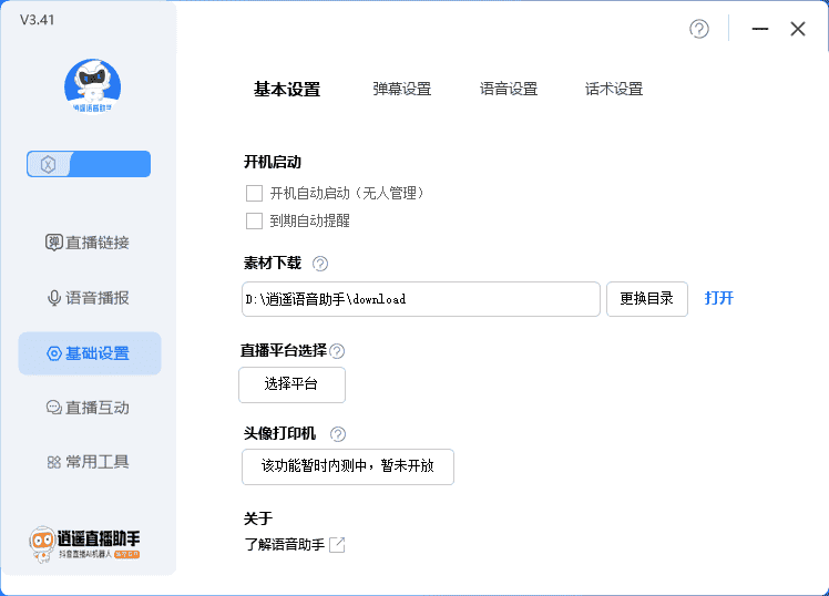 1.语音播报:礼物答谢、用户关注、加粉丝团、进直播间,评论弹幕五种数据的自动语音播报,可自定义语速、音调、播报人、频率等播报参数。