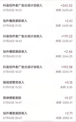 这类账号的变现形式也是多种多样的:1.景区推广:首先你的视频内容是类似于航拍的那种,那么,当你有了一定的粉丝量后,有些景点可能就会过来找你帮忙打广告。2.养号卖号:这类账号内容做好了,播放量都是很大的,涨粉也很快,可以批量起号,做矩阵,等粉丝量上来了把号卖掉也能赚到不少钱,然后继续起号。3.收徒:可以把视频制作过程做成教程,有人拜师了,把教程交付给他,一个徒弟收个几百,一个月收几个徒弟也有个小几千的收入。4.星图任务:可以去星图上搜索旅游行业,接一些旅游方面的广告,或者其他符合你视频内容的广告都行。5.广告分成:抖音新出的一种变现方式,加入后,抖音会在你的视频左下角展示广告,用户看到并点击进去,你就会有收益,播放量越大,点击越多,你收益越高,而我们这类视频的特点就是播放量大,完美契合。之前把这类视频的制作方法教给了一个朋友,下图是他7月份的广告分成收益