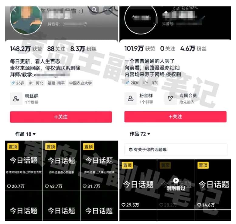 今天和大家分享一个最近特别火爆的视频,今日话题视频玩法,相信有很多小伙伴在刷抖音的时候,都刷到过下面这种视频,有的博主只发18条作品,就涨粉8.3万,点赞数量高达148.万,数据非常惊人。