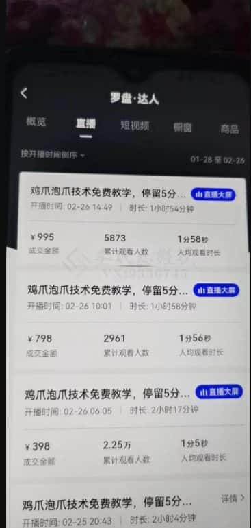 2月26号,问他收益是多少,2月26号两小时卖了2,000,2月26号10:01播了1小时58分卖了798,2月26号早上6;00播了两个小时多卖了390,加起来就已经有2,000块钱了,2,000块钱他拿70%剩下30%给他那个老师,他大概能达到1,400。
