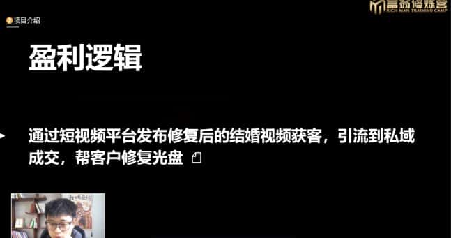 通过短视频平台发布修复后的结婚视频获客,然后引导到私域进行成交,帮助客户修复光盘。有很多的人他们婚姻可能结婚结了好几年或者说他们的长辈有想回顾一下当时结婚的场景,他们可能又翻出来以前的光盘看一看以前的记录。做这个项目其实也是要多号操作,矩阵操作你的流量才多。