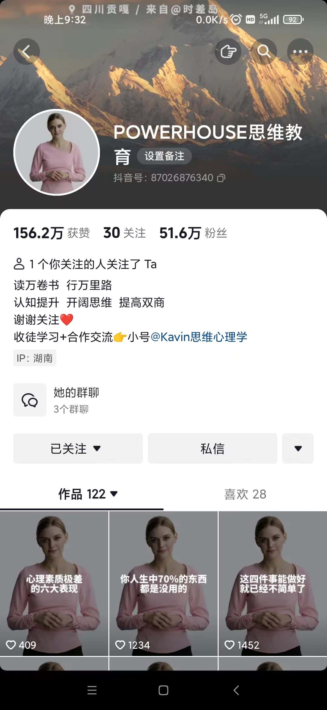 AI数字人是继国学小和尚后最新刚新起的项目,目前做的人不多,视频内容也是非常的简单,一个外国女人 + 一段鸡汤文案,熟练的话几分钟就可以制作出来,而且还是原创,另外,这类账号还有个共同的特点,就是涨粉非常快,主要就是利用了我们中国人一个不好的习惯,大家都知道我就不说了,总是认为外国的东西是好的,外国人说的话都是对的(汗)。