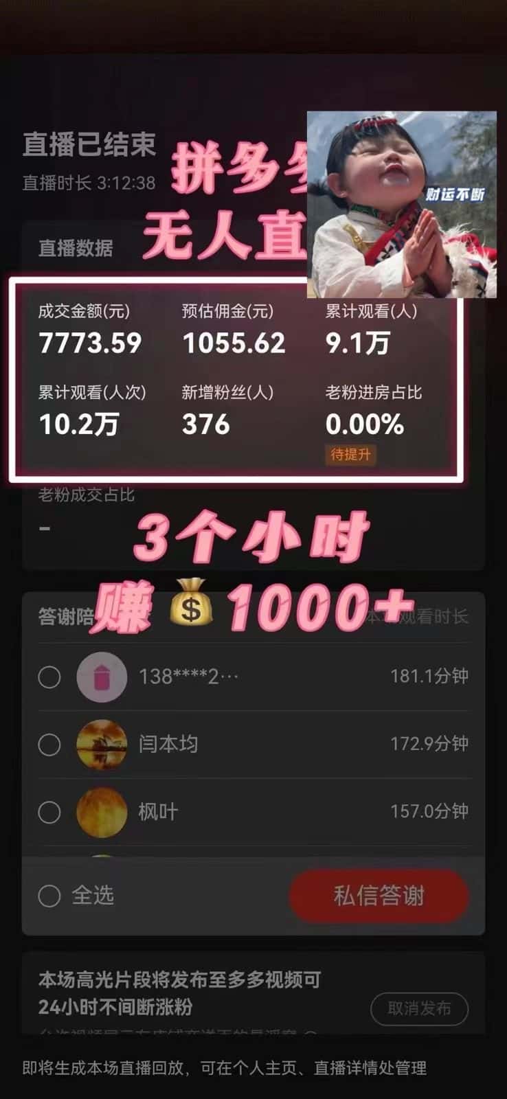 大家好,说起拼多多,可能大家印象比较深的就是东西很便宜,买东西很划算。最近几年由于抖音、快手直播带货的兴起,对淘宝、拼多多这些传统的电商带货平台的冲击比较大。在激烈竞争下,这些平台也逐渐开始发展直播赛道,并且给予新人有很大的流量扶持,特别是拼多多,这个冷门赛道目前做的人比较少,正处于项目红利期。并且它的流量要比抖音快手更加精准,转化率超高。最主要的是无门槛,不需要保证金,不用养号,0粉可以直接带货,平台管控不是很严,以前在抖音上做过无人直播,方法照搬过来同样适用。我们今天要讲的就是其中一种最简单的手机无人直播,手机放音频就可以,小白也能轻松上手。经过实操测试这种方式带货,日入2600+不是问题。