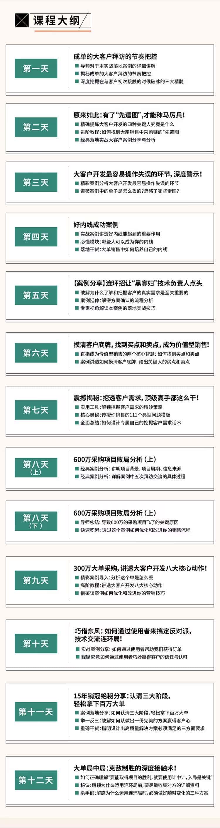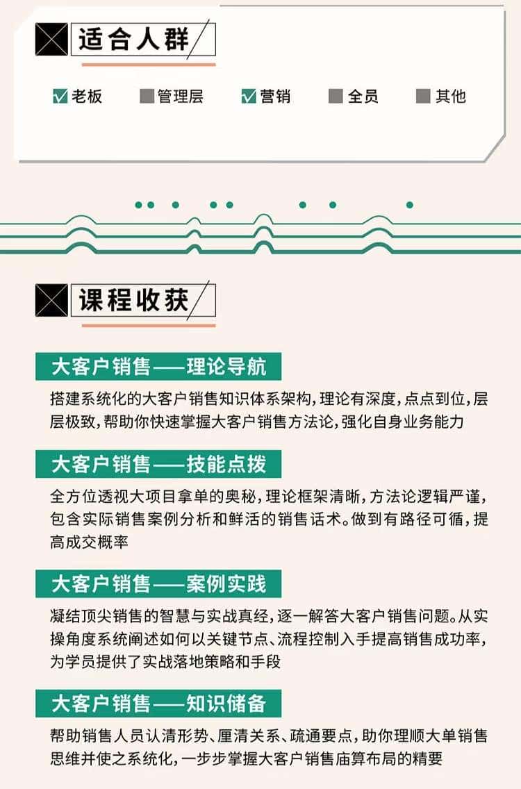 大客户销售业绩提升学这套 本内容基于理论框架模型,通过经典的实战案例,解读详的大单销售过程,摒弃“只教套路,不教思路”的陷阱,普及大单销售常识,训练大客户销售思维,梳理大单销售成功运作的要点、流程,通过深入剖析大单销售的成功运作。