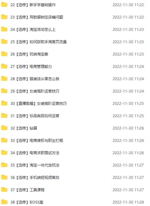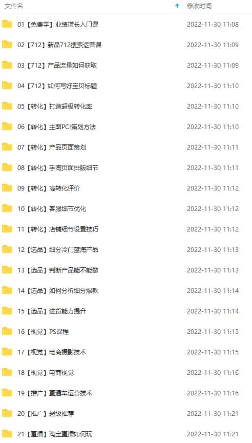 本套课程对于淘宝天猫推广讲的非常细致,从如何获取流量、产品策划、短视频的策划、手淘页排版细节、高转化评价、客服细节优化、对产品的ps以及摄影、电商视觉等都做了详细的讲解,后面讲到直通车运营技术生意参谋钻展等一套完整的天猫业绩增长课程值得去看。