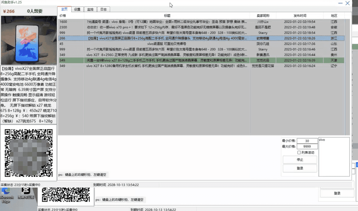 当前软件可以实时在线自动采集咸鱼用户最新发布的商品,并且支持自定义设置采集关键词,比如可以采集手机,电器等等任意闲鱼支持售卖的商品,简单点来说,也就是用户刚发布出来的商品,软件就能直接采集出来了,如果采集出来刚好有自己心仪的商品,可以直接用手机闲鱼APP扫软件左侧的商品二维码去闲鱼内与商家去了解商品详细信息了,第一时间就可以获取到,也算是一款捡漏助手软件。