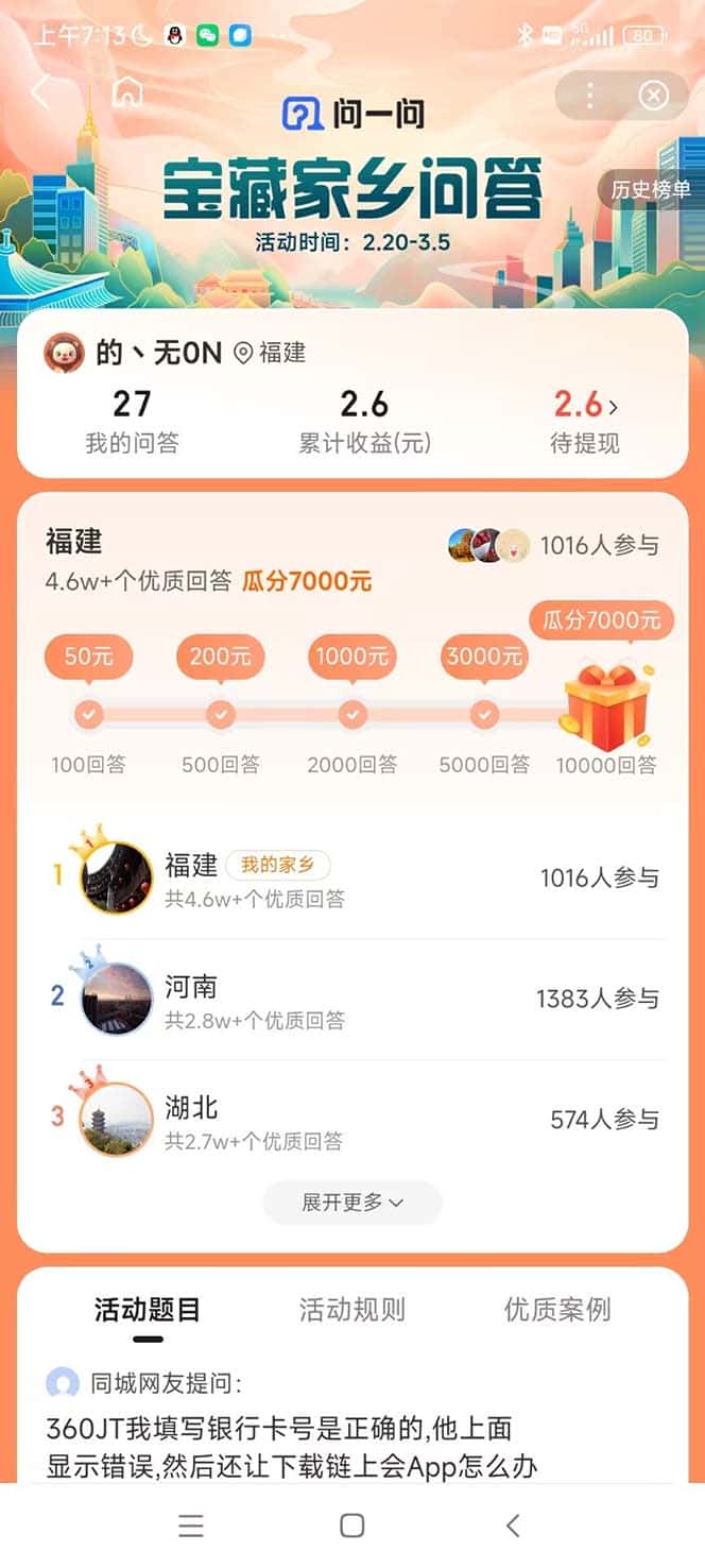 家乡答题的题目佣金是日结算的,也就是当天答题完毕24小时后【次日】结算,满1元就可以提现,排行榜激励奖励是次月25日(此处做下纠正,网盘内教程我录视频教程的时候没解释清楚误导大家了,已测试,日常答题是次日结算的,满1元起提)。