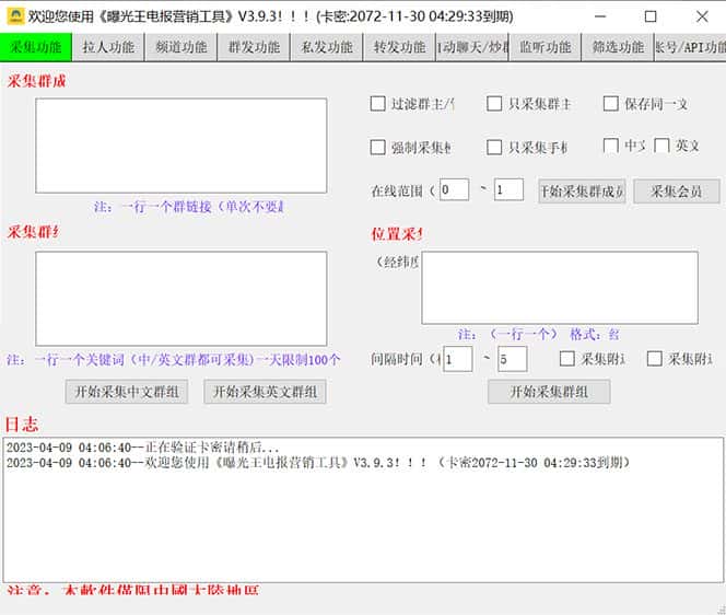 采集+拉人+加群+群发+私发+转发+炒群+监听+筛号+频道订阅+修改账号信息+账号登录等功能