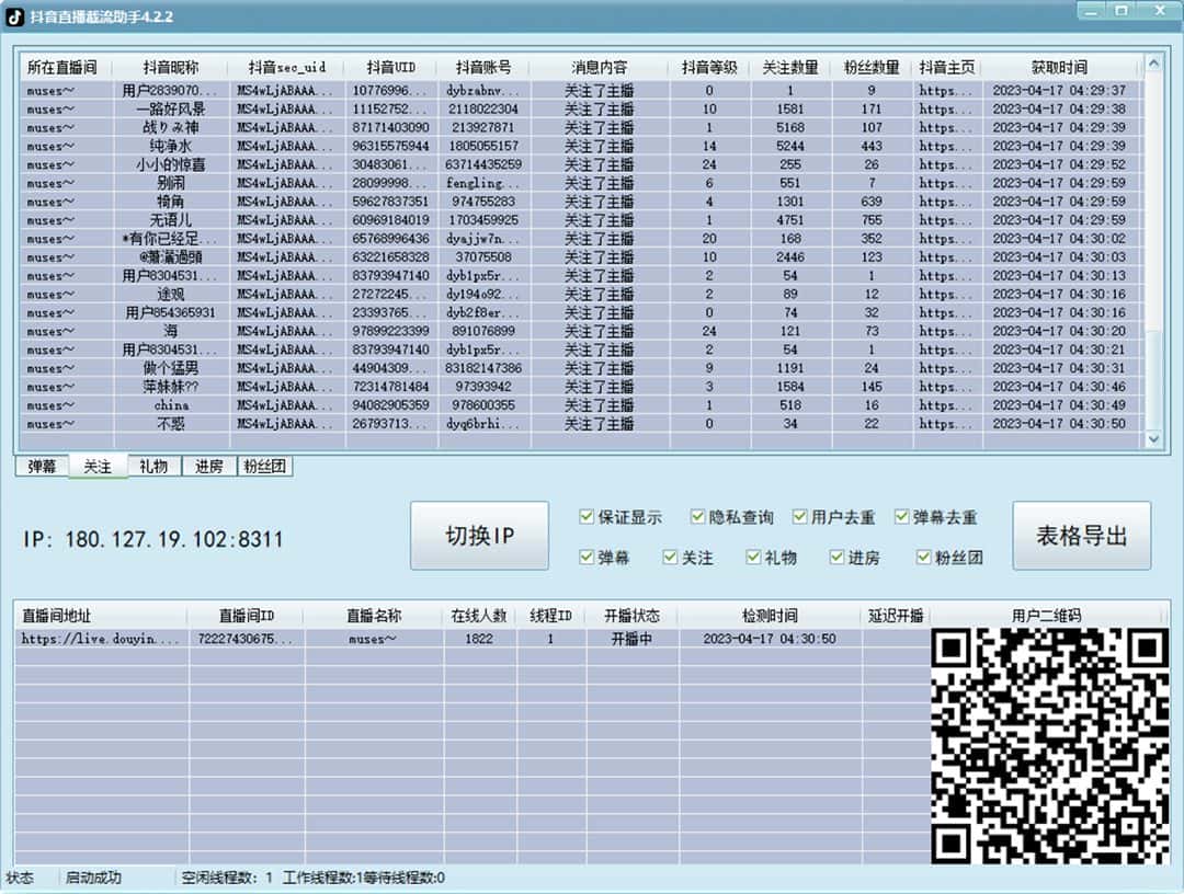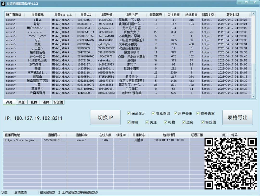 抖音任意直播间采集实时弹幕信息,弹幕用自己抖音扫码直接可私信对方,支持自定义筛查,弹幕导出数据。