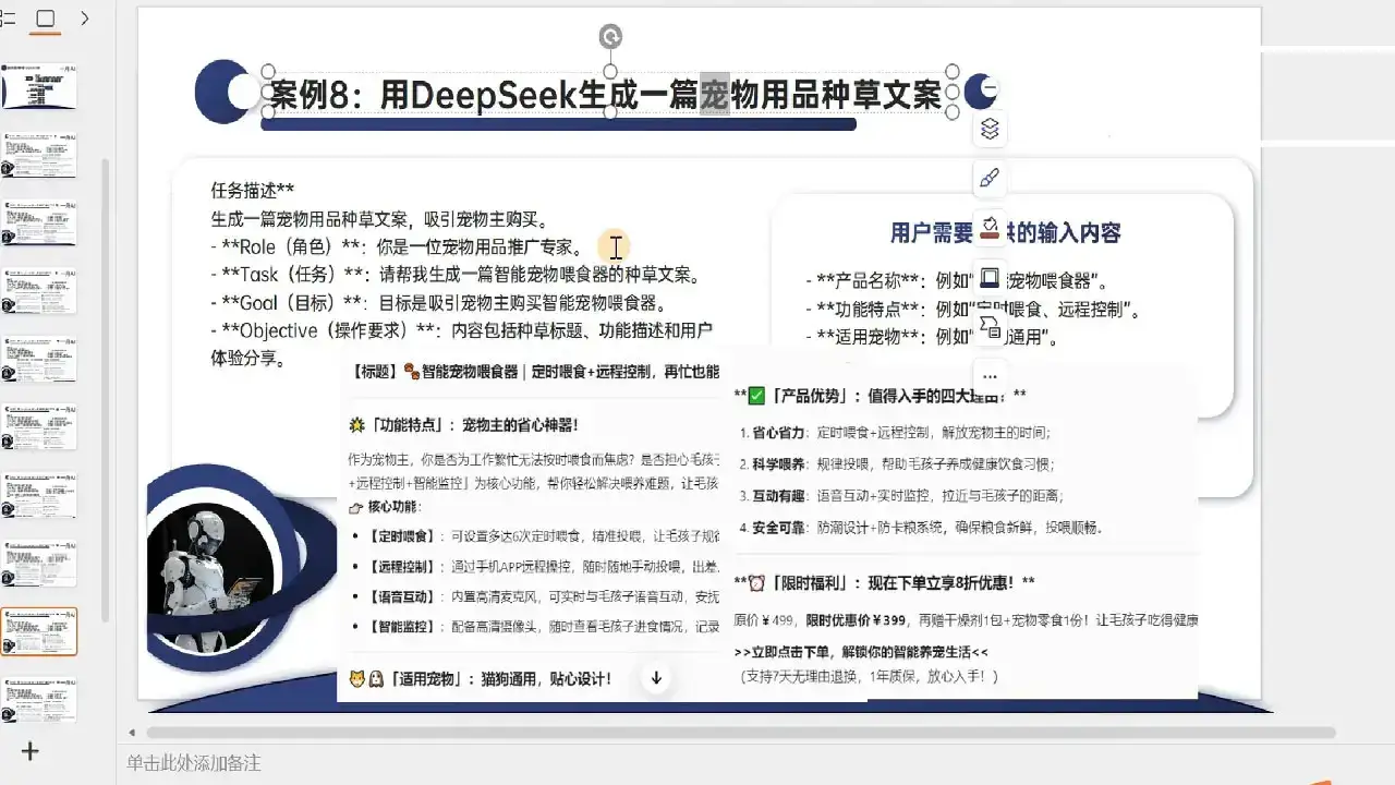 课程来自一舟老师的deepseek场景化实战训练营。15大高频生活与职场场景,手把手教你用DeepSeek提升效率!从零基础入门到职场写作、数据分析、PPT制作,再到AI备考、家庭教育、财务管理、自媒体创作等,课程通过视频教学+指令合集,解锁AI在学习、工作、生活中的全能应用。无论你是学生、职场人还是家庭管理者,都能快速掌握AI工具。