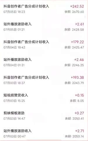 这类账号的变现形式也是多种多样的:1.景区推广:首先你的视频内容是类似于航拍的那种,那么,当你有了一定的粉丝量后,有些景点可能就会过来找你帮忙打广告。2.养号卖号:这类账号内容做好了,播放量都是很大的,涨粉也很快,可以批量起号,做矩阵,等粉丝量上来了把号卖掉也能赚到不少钱,然后继续起号。3.收徒:可以把视频制作过程做成教程,有人拜师了,把教程交付给他,一个徒弟收个几百,一个月收几个徒弟也有个小几千的收入。4.星图任务:可以去星图上搜索旅游行业,接一些旅游方面的广告,或者其他符合你视频内容的广告都行。5.广告分成:抖音新出的一种变现方式,加入后,抖音会在你的视频左下角展示广告,用户看到并点击进去,你就会有收益,播放量越大,点击越多,你收益越高,而我们这类视频的特点就是播放量大,完美契合。之前把这类视频的制作方法教给了一个朋友,下图是他7月份的广告分成收益