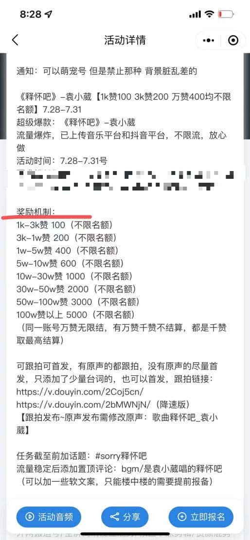 三、我们如何通过来变现呢?a、抖音推广音乐赚钱有专门的音乐推广渠道,有点赞就有钱。正常1K-3K赚100-2003K-5K赚200-3005K-1W赚400-6001W-5W赚600-8005W-10W赚800-100010W-30W赚1000-120030W-50W赚2000-300050W-100W赚3000-4000100W以上6000b、卖千粉账号赚钱一个千粉账号目前一手回收价钱在一千左右