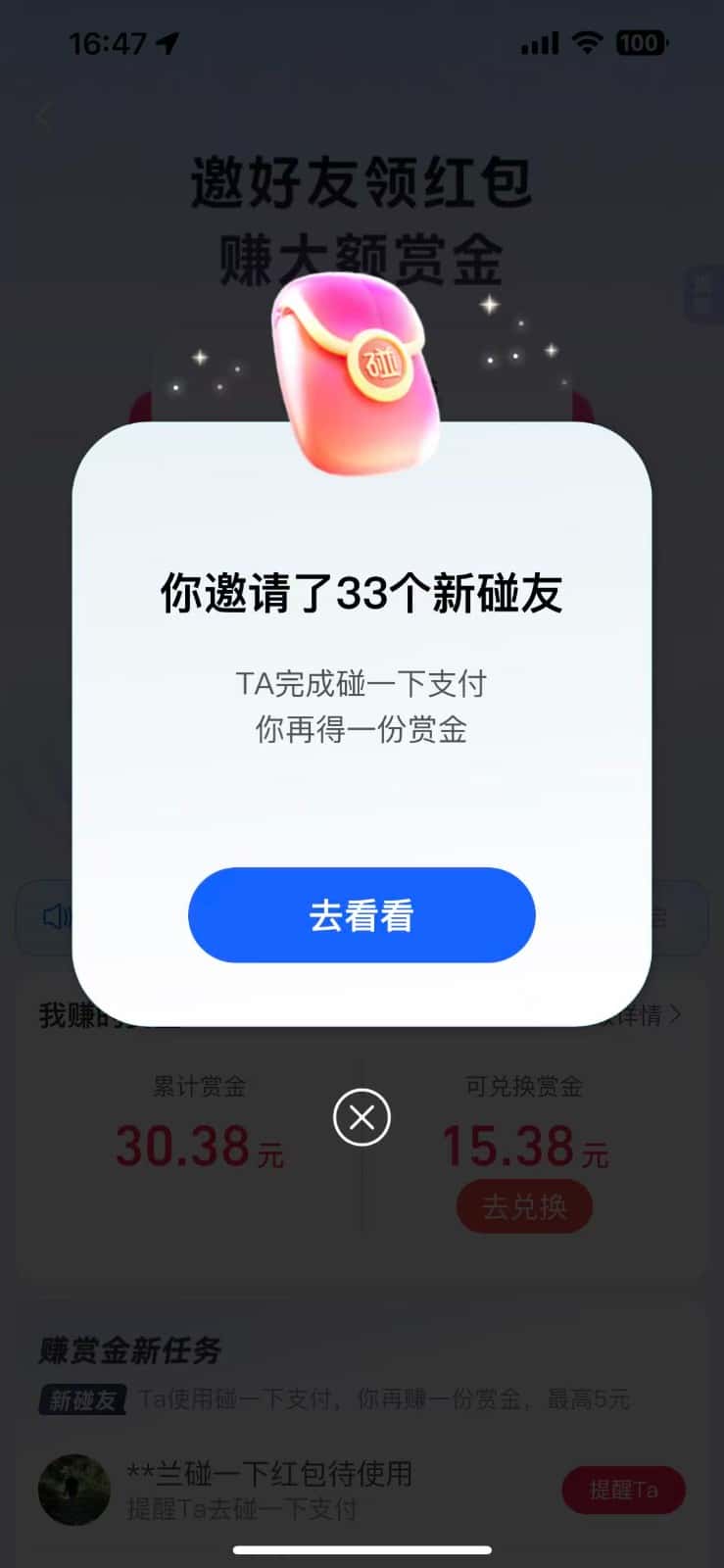 支付宝的碰一碰功能,大家肯定都不陌生吧?最近推出的新活动,天天都有,尤其是周五的碰友日最高能领15元红包,那叫一个香啊!而且,碰一碰还有推广赚赏金的活动,邀请用户扫你的推广码,你就能获得佣金奖励,购物消费两不误,和之前的赚钱红包码原理一样。